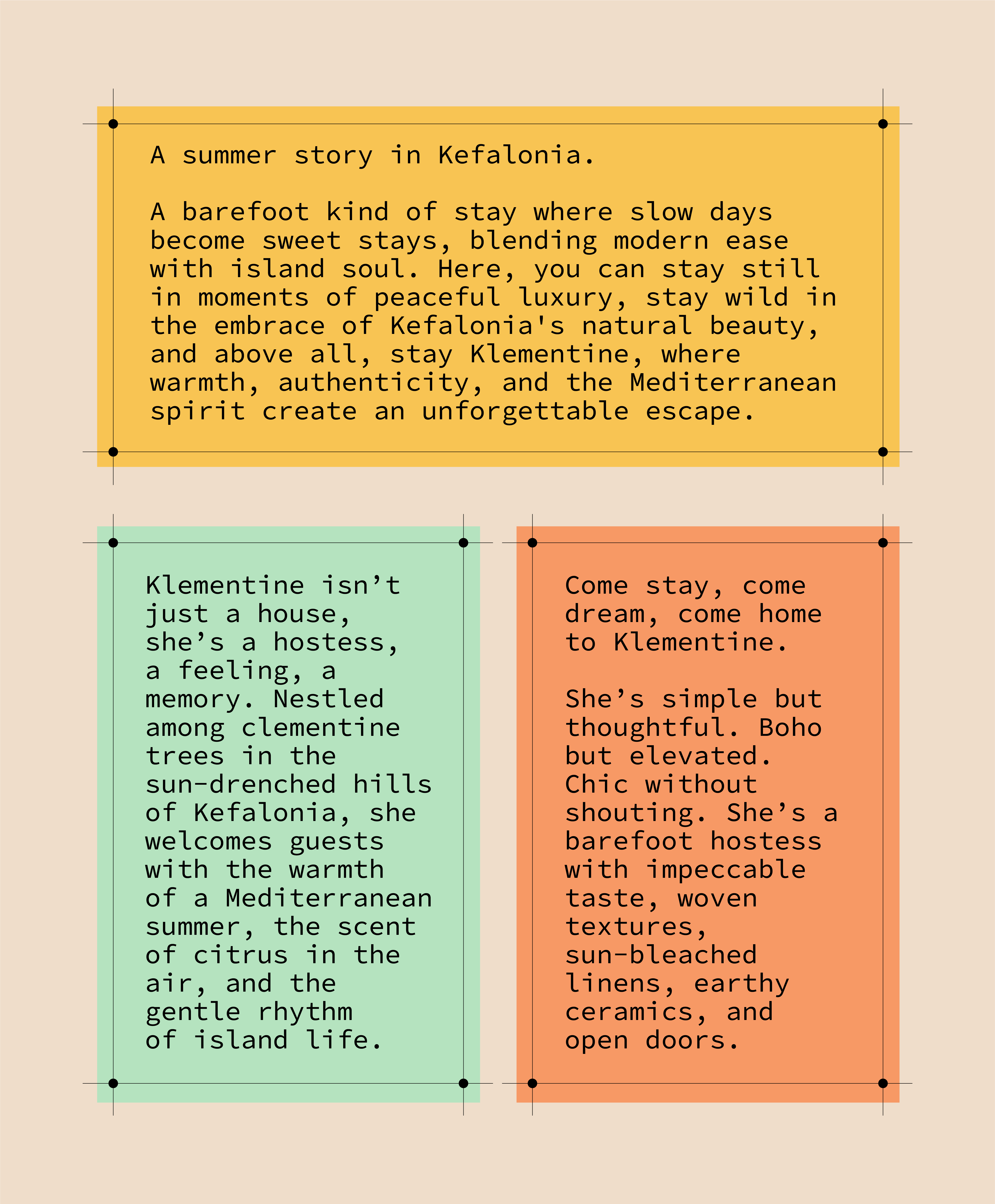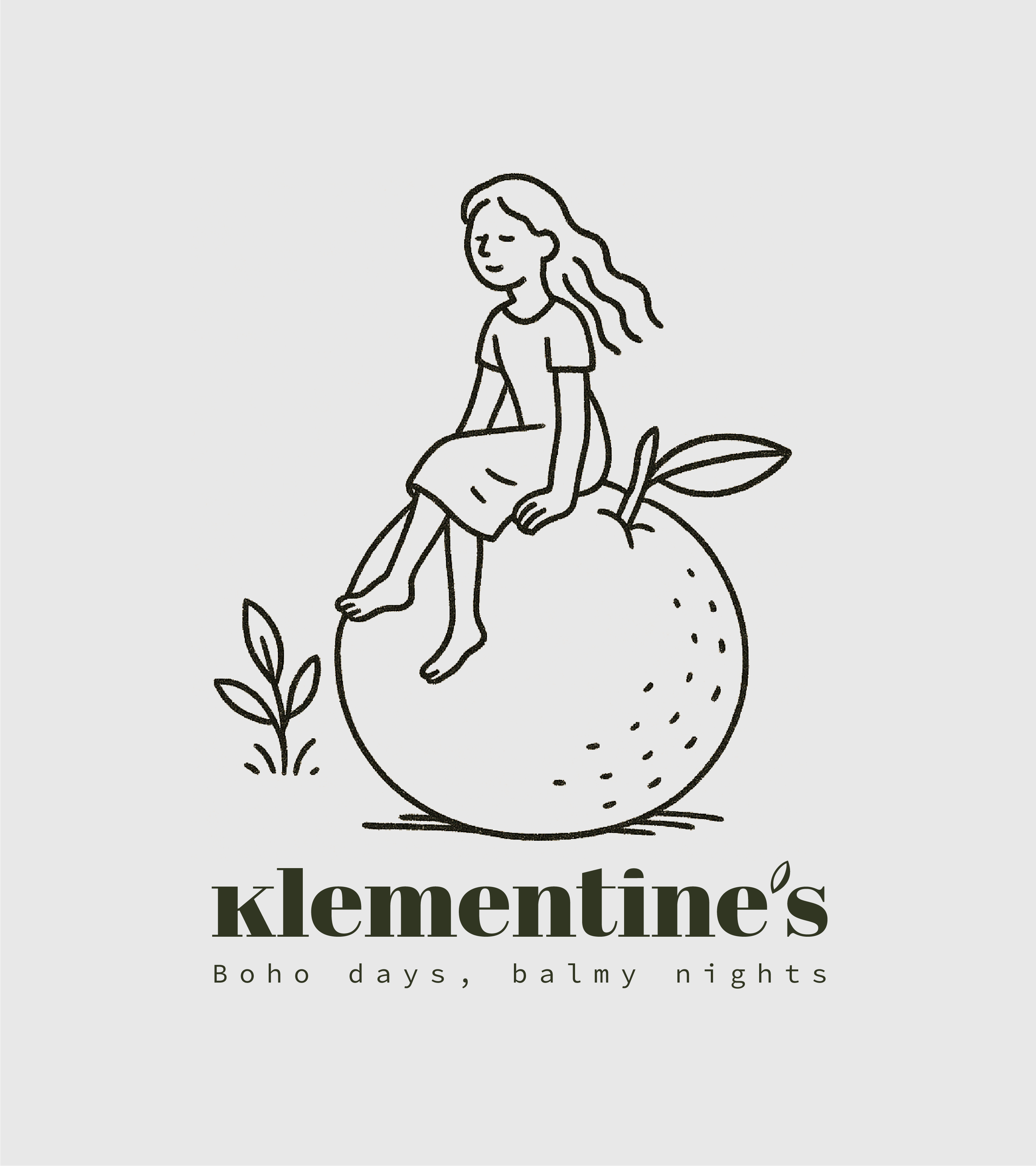 Klementine is a brand identity for a boho-chic summer house in Kefalonia, Greece, conceived as a living character rather than a place. Named after the citrus trees in its garden, Klementine embodies warmth, hospitality, and the slow rhythm of island life.