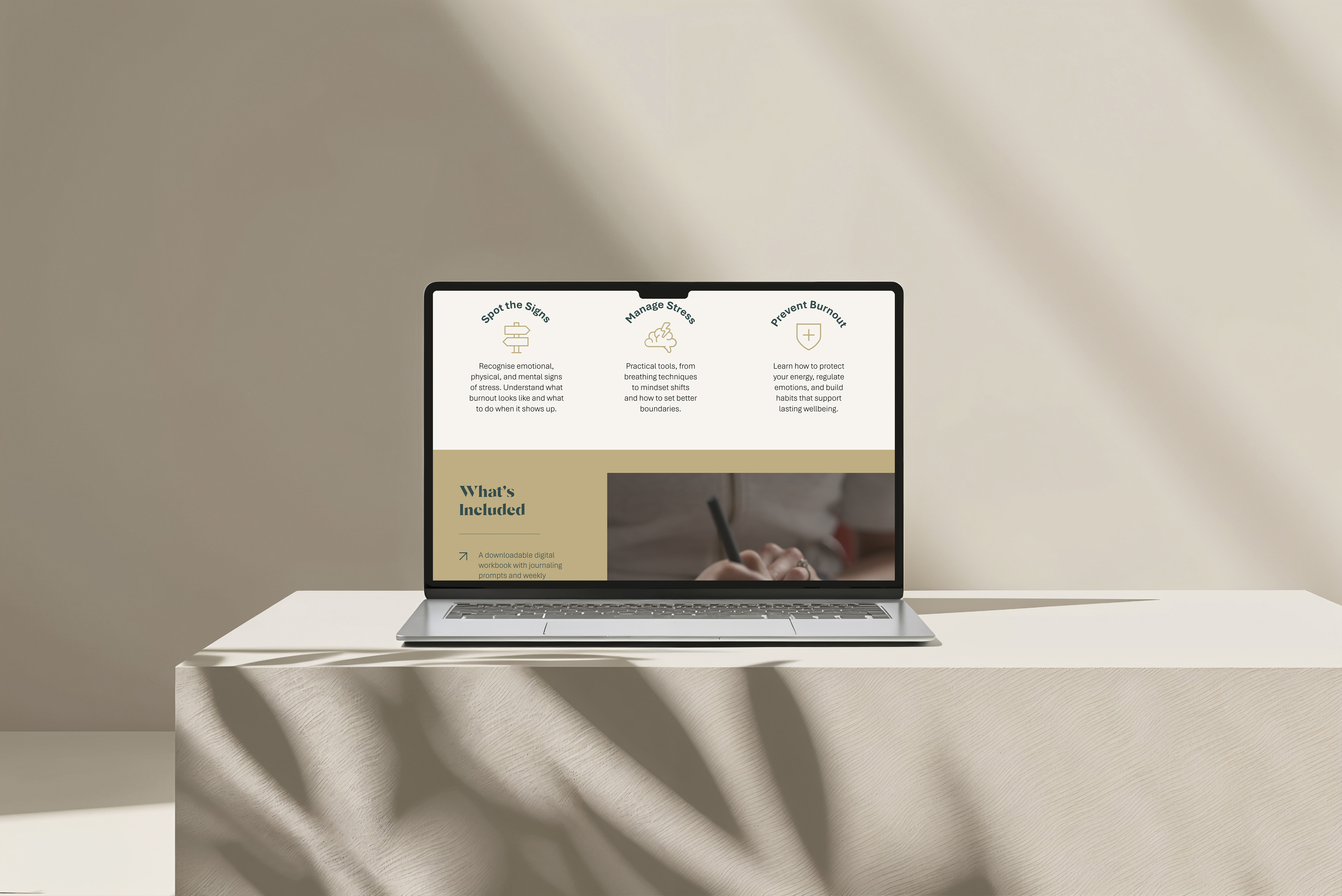 Designed to bring a sense of calm and clarity to workplace wellbeing, this branding and microsite experience reimagines how learning around stress and burnout can feel. I developed the visual identity and UX for Overcoming Stress & Burnout in the Workplace, creating a digital space that encourages pause, reflection, and trust.
